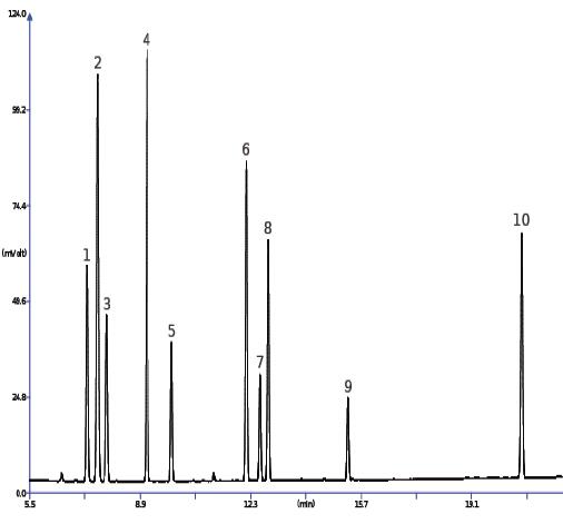 升溫程序:40 ℃(2 min), 8 ℃/min, 210 ℃ , 2 ℃/min